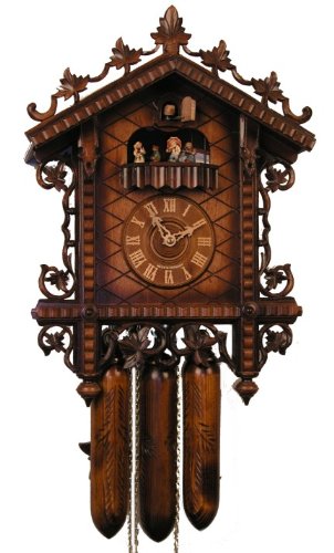 A traditional Black Forest Railroad House from 1870 with hand-carved leaves and wooden weights. Cuckoo on the hour and half hour, figurines dance to the music on the hour. Clock Movement: 7-Day(wind-up once a week) Regula movement with night off. Gold-plated chime, brass-hammer and big bellows (deep cuckoo sound). Musical Movement: Reuge musical movement (22 tones) with two different melodies (EdelweiĆ & The Happy Wanderer). Clock Face: Wooden Face, Diameter 4 Inches with wooden hands. Dancing Figurines: Carved and hand-painted wooden children figurines like Hummels . Pendulum: Herr Bolt Pendulum with fine adjustment. Creator: This clock is hand-signed by the creator Adolf Herr on the back side. The creator´s autograph guarantees the experience of 6 generations of making clocks. MADE IN GERMANY
